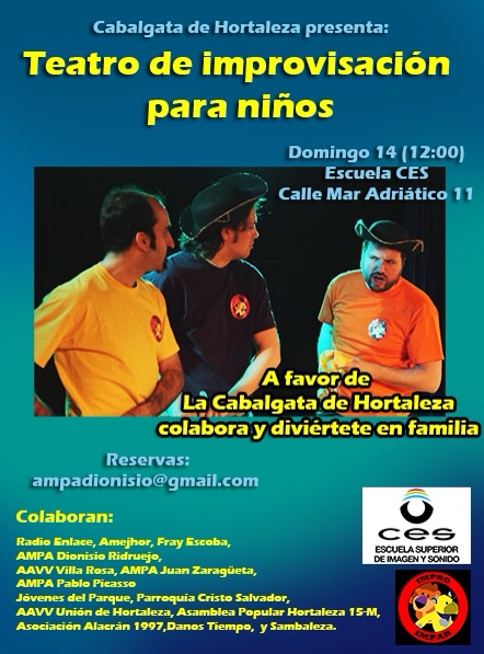 Teatro de improvisación para niñas y niños a beneficio de la Cabalgata de Hortaleza por admin | Dic 9, 2014 | Eventos, Noticias | 0 Comentarios Enviar comentario Cancelar la respuestaTu dirección de correo electrónico no será publicada. Los campos obligatorios están marcados con *Comentario * Nombre * Correo electrónico * Web Guarda mi nombre, correo electrónico y web en este navegador para la próxima vez que comente. Δ