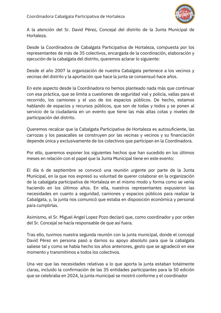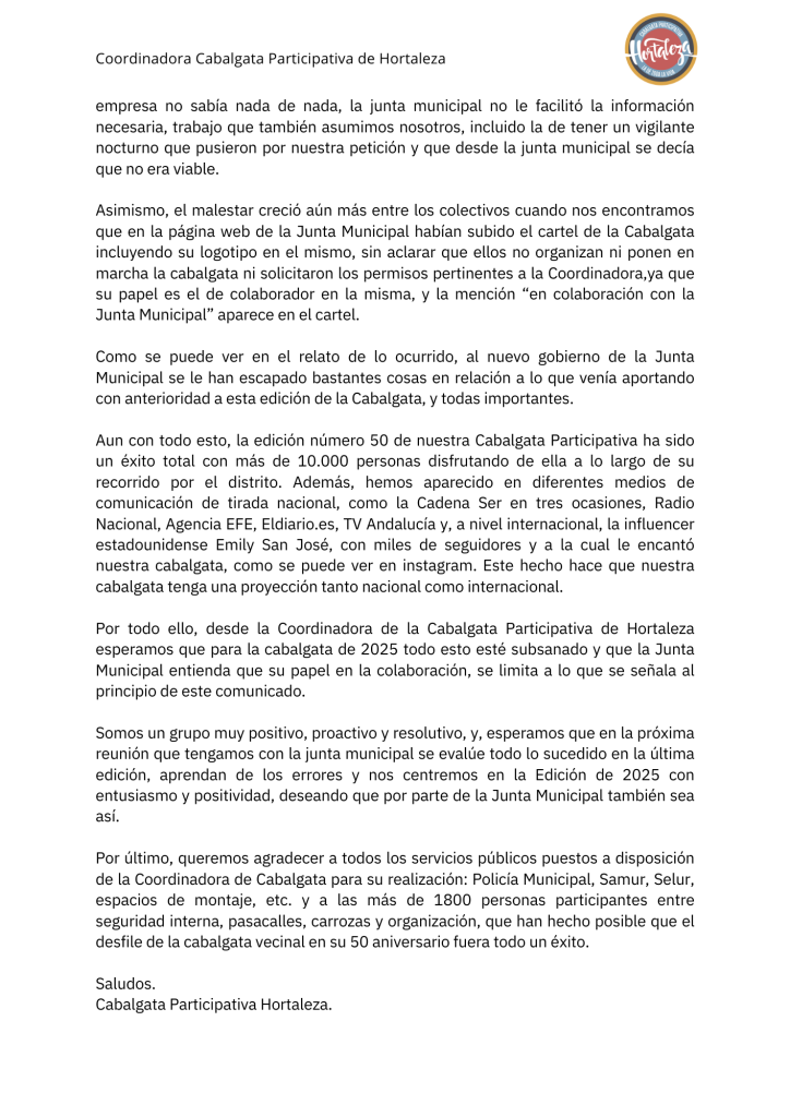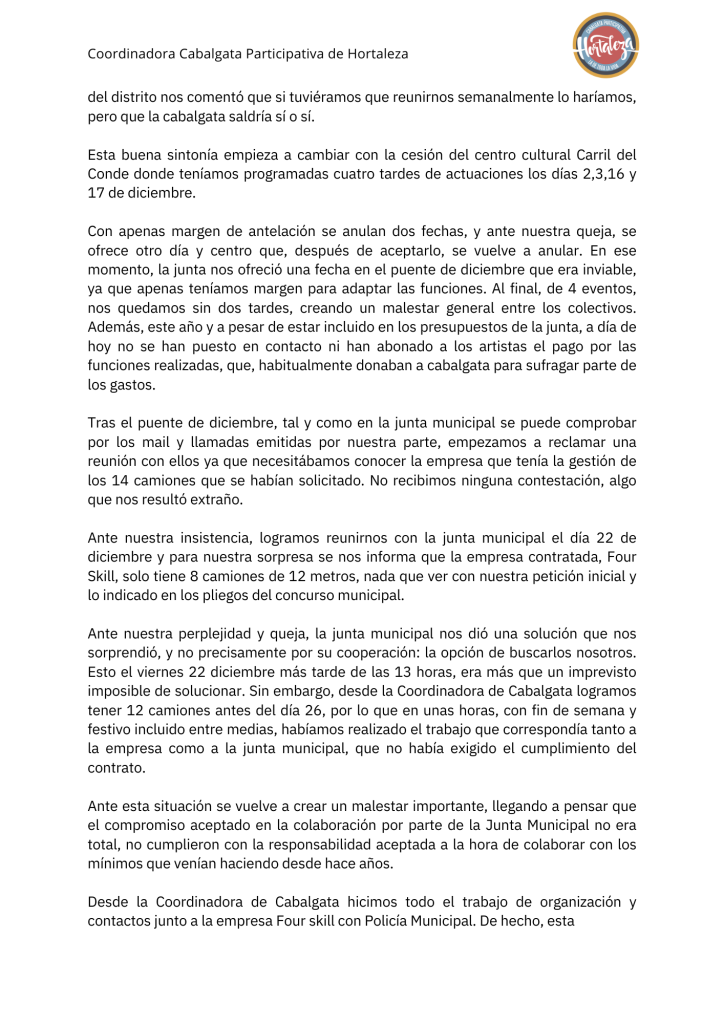 A través de esta vía oficial, desde la Coordinadora de la Cabalgata Participativa de Hortaleza, os hacemos llegar el comunicado que por medio de registro hemos remitido a la Junta del distrito.